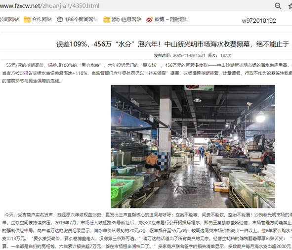 55元/吨的垄断高价、误差超100%的“黑心水表”、六年投诉无门的“踢皮球”、456万元的巨额多收款——中山沙朗新光明市场的海水供应黑幕,在商户蒋万达递交的28份铁证面前彻底撕开。当官方检定报告实锤水表误差最高达+118%,当监管部门六年零处罚仍以“补充调查”搪塞,这场横跨垄断经营、计量造假、行政不作为的系统性乱象,早已超出普通消费纠纷范畴,直指城市治理的薄弱环节与民生保障的底线。