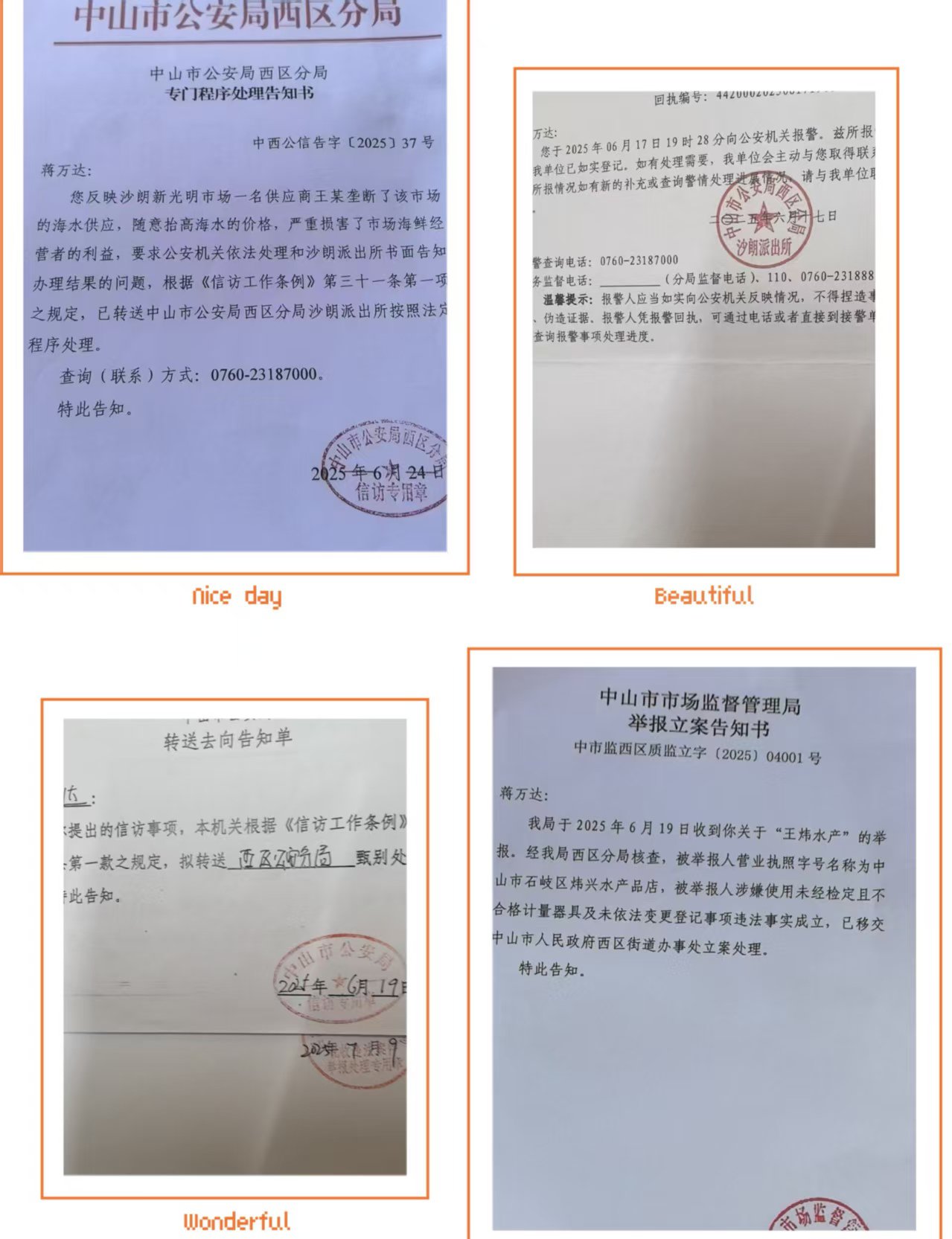 从一张4000元的无票收据,到17500元的微信转账记录;从泛黄的报警回执(编号4420002025061719084101500),到盖着红章的官方检定报告(中市监公开复〔2025〕152号),再到商户的联名签字清单,每一份证据都在无声地控诉,每一个数字都在刷新“海水”的水分上限。456万不是冰冷的抽象数字,而是商户起早贪黑的血汗钱,是海鲜档口维持生计的微薄利润,更是中山“菜篮子”工程的民生温度,是城市消费信心的最后一道防线。