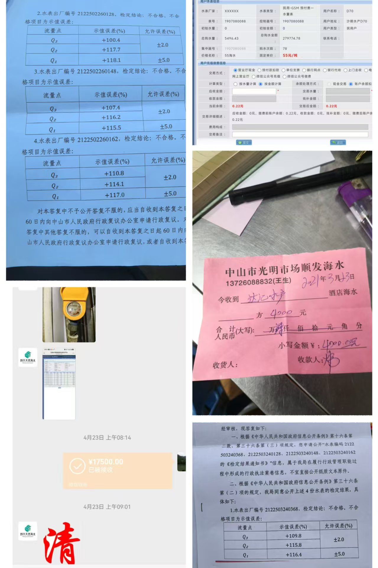 比高价更离谱的是赤裸裸的计量造假。市监局出具的中市监公开复〔2025〕152号检定报告显示,市场4块核心总水表全部不合格,误差范围高达+100.4%至+118.1%,而国家规定的水表允许误差仅为±2%。这意味着商户每缴纳1吨水费,实际仅能用到约0.5吨水,剩下的全是被强制收取的“空气费”。按市场日均售水100吨、运营2281天(2019年7月至2025年10月)测算,6年理论多收金额高达456万元;即便扣除夜间非高峰时段用量、设备检修期等客观因素,律师保守核算,商户被多收费用仍超228万元。蒋万达展示的微信转账记录中,4000元、7150元、9900元、17500元等大额无票收费记录比比皆是。“收钱不开正规发票,水表还偷偷多走字,这根本不是经营,就是明抢!”