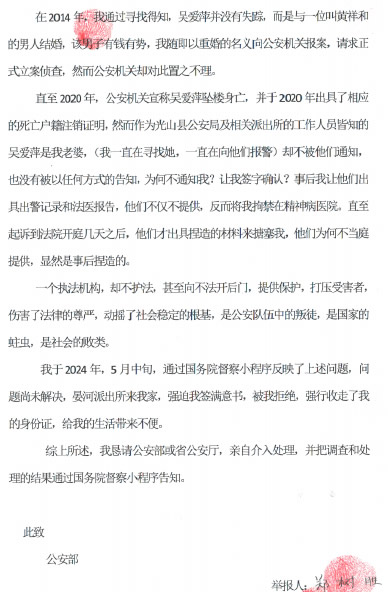 我叫郑树胜,籍贯河南省信阳市光山县。自2014年起,我数百次向市公安局、省公安厅、公安部求助、控告光山县某部门违规操作。具体事由为:在我老婆吴爱萍与黄祥和的重婚案件中(他们虽然重婚,却先说失踪,后又拒绝同我离婚),我作为受害者,不仅未得到公安机关应有的法定援助,反而屡遭光山县某系统的不公正对待和再次迫害。他们循私舞弊,编造虚假事实,并在法庭上提供伪证,严重阻碍了我通过法律途径解决问题。