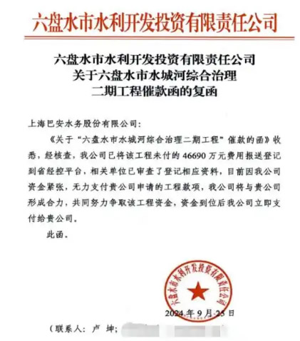 上海巴安水务与代表六盘水市政府的地方国有集团公司——六盘水市水利开发投资有限责任公司(下称“六盘水水投”)签署了总额约16亿元的重大民生工程合同,该工程已建设完成近10年。为明确工程款金额,上海巴安水务与六盘水水投曾共同委托外部机构,历经一年多时间完成审计并确定应付款金额。