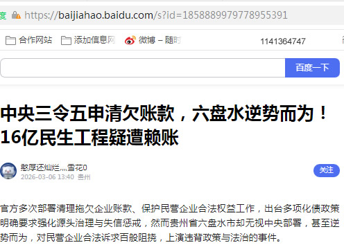 官方多次部署清理拖欠企业账款、保护民营企业合法权益工作,出台多项化债政策明确要求强化源头治理与失信惩戒,然而贵州省六盘水市却无视中央部署,甚至逆势而为,对民营企业合法诉求百般阻挠,上演违背政策与法治的事件。